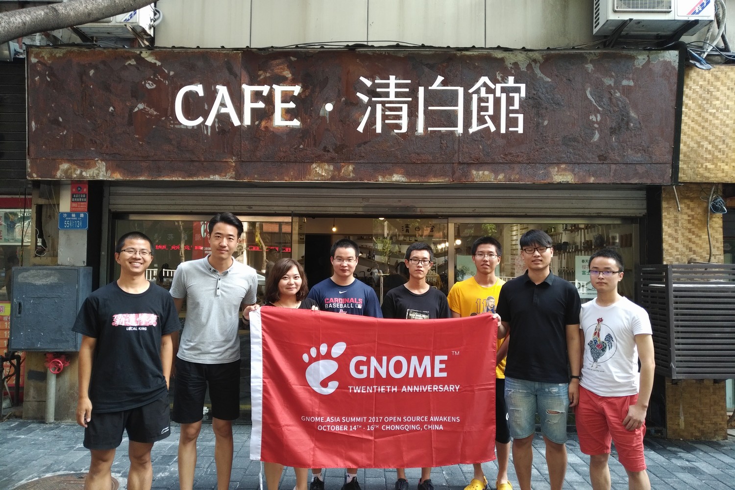 最后咖啡馆老板很好心地帮我们一起拍了张合影,当然还有我们如影随形的 GNOME 大红旗